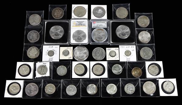 Assortment Of Silver Dimes, Silver Half Dollars, Peace Silver Dollars, Morgan Silver Dollars, & American Silver Eagles, 1878-2016, group includes: (3) 90% Mercury silver dimes, 1923, 1925, 1941 in Fine-XF condition (1) 1883 Seated Liberty dime in VG condition (6) 90% silver Franklin halves in Good-VF condition, dates include: 1948, 1953, 1958, 1963 (7) Walking Liberty half dollars in VG-VF condition, dates include: 1934, 1936, 1941, 1942, 1944, & 1946 (1) 1964 90% Kennedy half & (1) 1966 40% silver Kennedy half (7) Morgan Silver Dollars: 1878-CC G-VG, 1880-O VF, 1884-CC Fine, 18__ (date rubbed off; AG condition), 1886 F-VF, 1891-O Good-Fine, 1897 Fine (5) Peace Silver Dollars: (2) 1922, 1923, 1926-S, 1927-S; in F-VF condition (5) ASEs: 2016 First Strike PCGS MS70 30th Ann., 2012-W First Releases NGC MS69 From Mint Sealed Box #15, 2013 (tarnish around rim) (2) 2012 Silver Eagles in UNC condition; a Egypt King Farouk silver coin; please inspect (37 total coins). Shipping charges apply - weight 2 lbs. (Image)