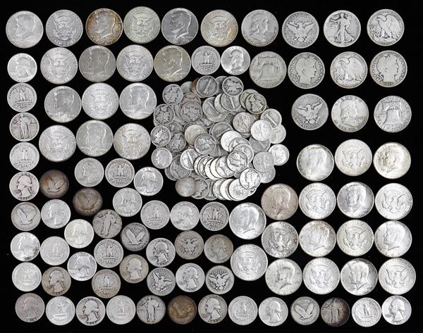 Group of 90% Silver and 40% Silver Coins, 1890s-1964, group includes: (4) Barber half dollars (3) Walking Liberty half dollars (4) Franklin half dollars, G-VF condition (all 90% silver) (17) 1964 90% silver Kennedy half dollars, VF-AU condition (16) 1965-1969 40% Kennedy half dollars, VF-AU condition (3) Barber quarters (10) Standing Liberty quarters (35) Washington quarters (all 90% silver, conditions ranges from G-XF) & a mixtture of (84) Barber, Mercury, & Roosevelt 90% silver dimes in G-AU condition; please inspect (175 total coins). Shipping charges apply - weight 3 lbs. (Image)