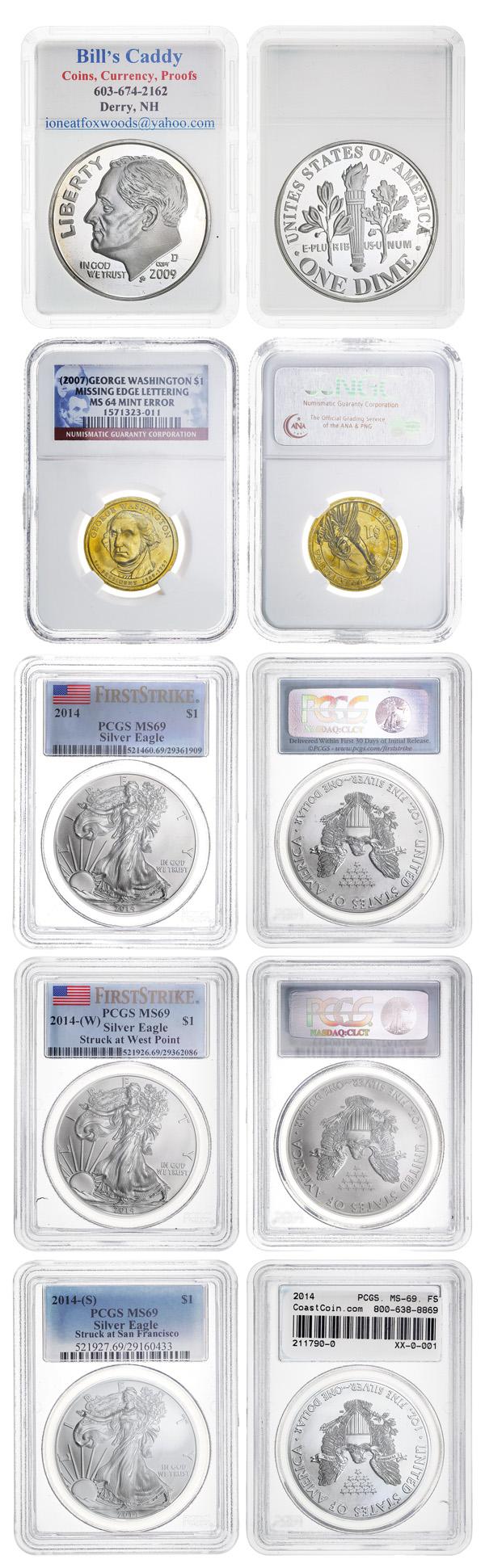 U.S. Silver Liberty Eagles Trio and Additional Coins, 2007-2014, lot of 5 coins, includes 3 different Silver American Eagles, all dated 2014 and graded PCGS MS69, West Point, San Francisco and one unattributed issue; also included is a 2007 presidential dollar with Missing Edge Lettering, NGC 64 Mint Error, and possibly a full ounce Silver proof round in a holder (5). Shipping charges apply - weight 1 lbs. (Image)