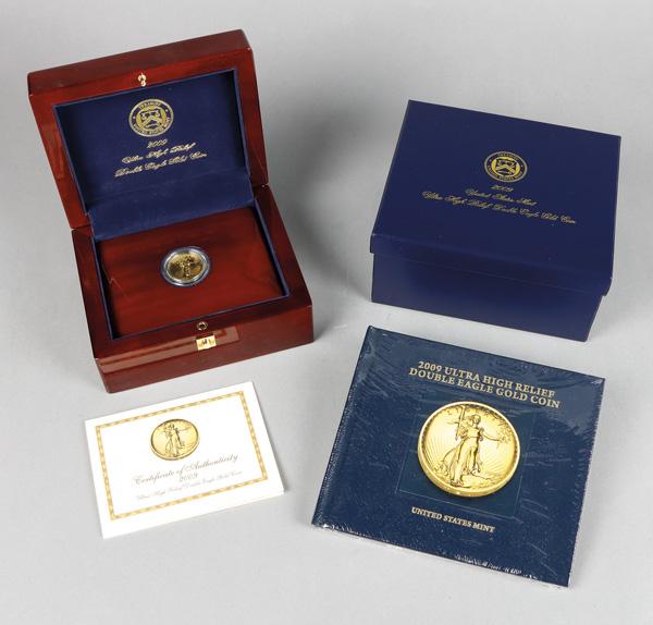 U.S. Ultra High Relief Double Eagle Gold Coin in Original Mint Packaging, 2009, Ultra High Relief $20 Double Eage gold coin, 1.001 Troy Ounce (31.108g) of 24K (.9999) Fine Gold, Business strike with no frosted surfaces, but the coin appears in proof condition with mirror like surfaces. One of the lovelier coins designed by the Mint. Shipping charges apply - weight 3 lbs. (Image)