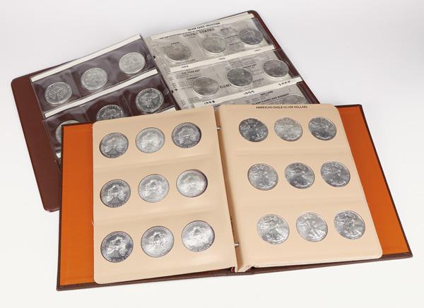U.S. Silver Eagle 1 Ounce Uncirculated Coin Collection, 1986-2020, lot of 36 Uncirculated 1 Ounce Silver Eagles mounted in 1 Dansco album and one other un-named album; condition varies from Uncirculated with light spots to CU or better condition (36 coins). Shipping charges apply - weight 5 lbs. (Image)