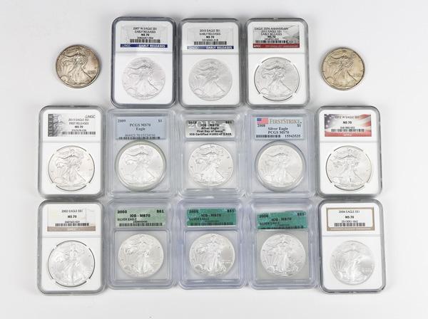 Assortment of (15) American Silver Eagles (13) Graded & (2) Raw, 1997-2018, the group includes: (2) 1997 in VG-VF condition, 2002 Eagle NGC MS70, 2003 Eagle ICGS MS70, 2004 Eagle NGC MS70, 2005 Eagle ICG MS70, 2006 Eagle ICG MS70, 2007-W Eagle Early Releases NGC MS70, 2008 Eagle First Strike PCGS MS70, 2009 Eagle PCGS MS70, 2010 Eagle Early Releases NGC MS70, 2011 Eagle 25th Anniversary Early Releases NGC MS70, 2012-W Eagle Flag Label NGC MS70, 2013 Eagle First Releases NGC MS70, & 2018 Eagle First Day Of Issue ICG MS70 (15 coins total). Shipping charges apply - weight 3 lbs. (Image)