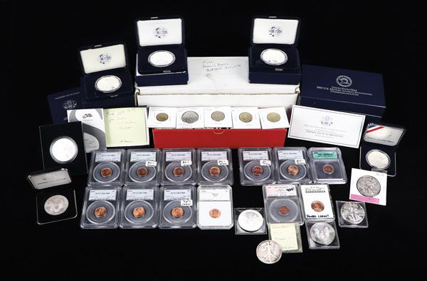 Collection Of U.S Silver Eagles, Commemorative Silver Dollars, Graded Pennies, & An Assortment of Foreign Coins, collection includes: (8) ASEs in OGP & (6) raw silver eagles (date unknown, 2001, 2002, 2013, 2014, & 2015); group of (4) commemorative silver dollars OGP; group of (13) Pennies graded by PCGS (9 of the coins), ICG, PCI, SEGS, & ANACS in various grades; & a group of circulated & uncirculated foreign minors from Hong Kong, Japan, Netherlands & many more countries (approximately 80+); inspect this lot for yourself and you might find some surprises; spreadsheet attached of the silver in OGP with greysheet prices. Shipping charges apply - weight 8 lbs. (Image)