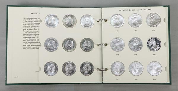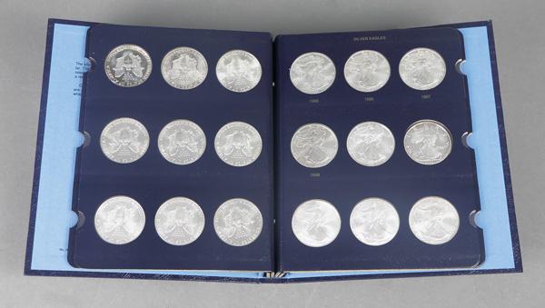 U.S. American Eagle Silver Collection: 1986-2023, album contains 27 Silver Eagles; includes: 1986, 1987, 1988, 1989, 1990, 1991, 1992, 1993, 1994, 1995, 1996, 1997, 1998, 1999, 2000, 2001, 2002, 2003, 2004, 2005, 2006, 2006-W, 2012, 2013, 2016, 2022, 2023, and three additional .999 silver bullion coins; coins are in excellent condition with a few featuring some toning; an excellent collection. Shipping charges apply - weight 3.8 lbs. (PDF for this Lot) (Image)