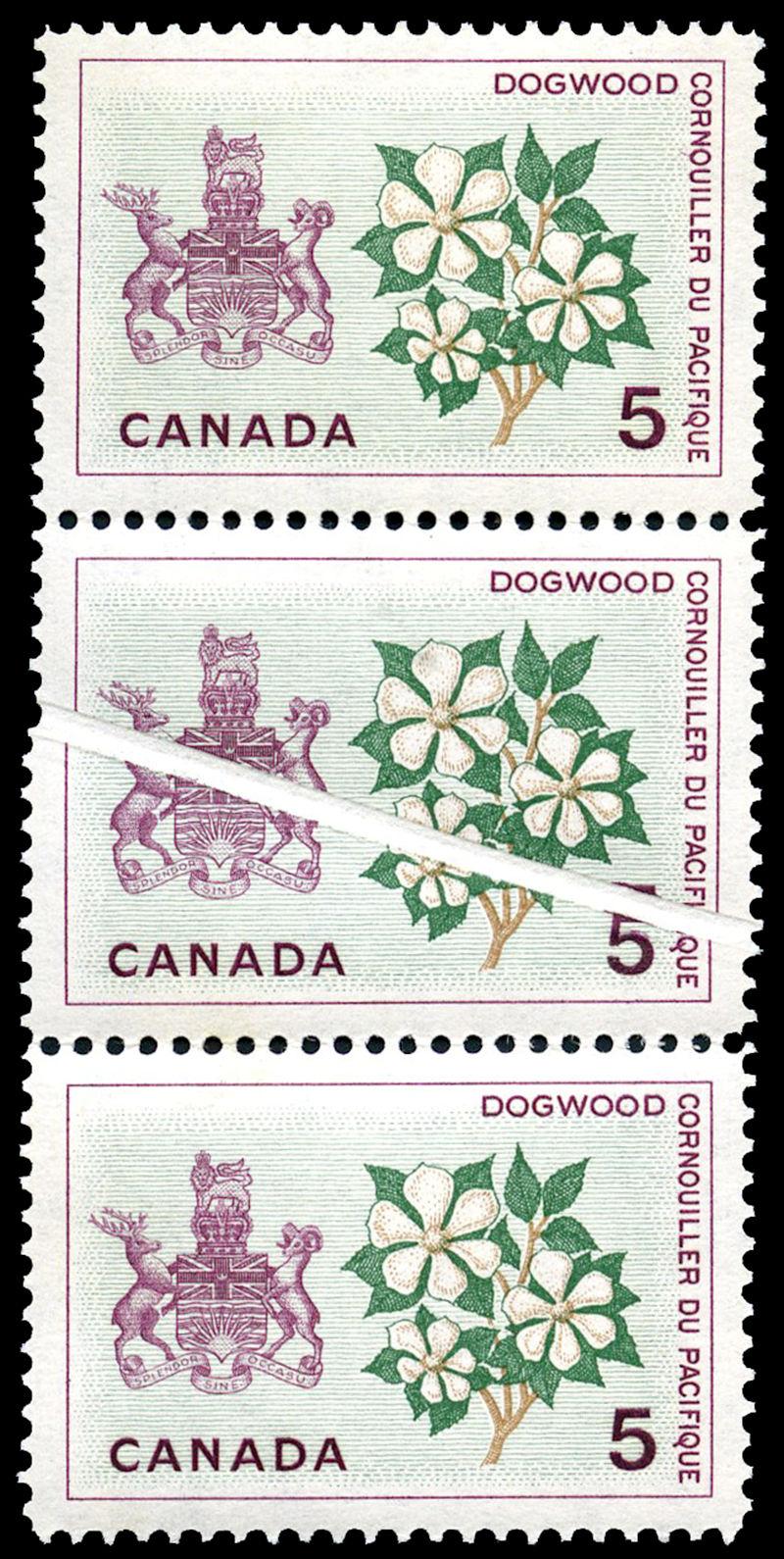 423var: 5¢ British Columbia Dogwood, strip of 3 with PRE PRINT PAPERFOLD, nh, striking. (Image)