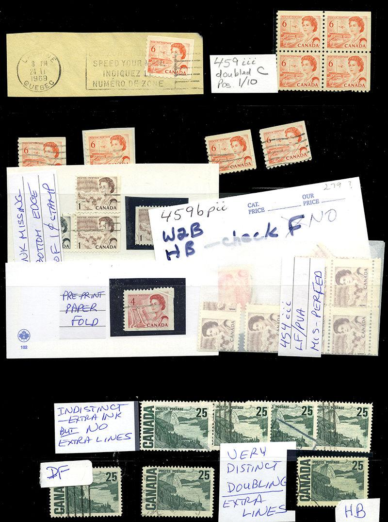 CENTENNIALS: VARIETIES: Good examples of the doubling varieties for 6¢, 8¢, 15¢, and 25¢ stamps; CV total $175 (5 x $35 used 6), $420 (7 x $60 used 8), $450 (2 x $100 mint pair, 5 x $50 used 15), $300 (2 x $100 DF, 1 x $100 HB 25) = $1345, plus many extras of the doubling varieties which are not as good, one 6¢ where 6 and CANADA are doubled, 459iii doubled C – 1 mint in block and 5 used CV total $250, 1¢ ink missing variety in Harris and misperfed examples, 4¢ PRE-PRINT PAPER fold. Inspect. (Image)