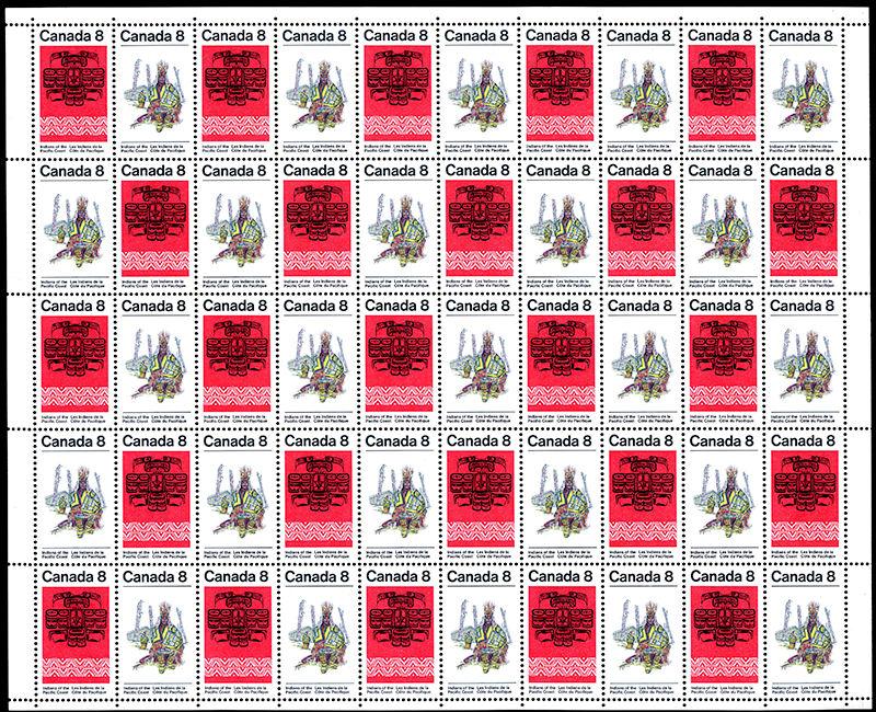 572ii: 8¢ Pacific Coast Indians cpl sheet of 50 with MISSING BIRD ON TOTEM variety (pos. 28), nh, very fine (Image)