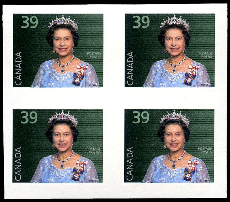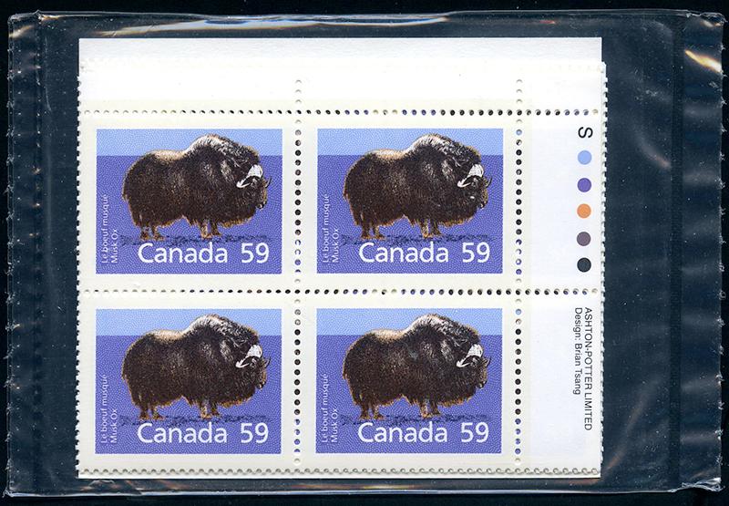 463iii var: 15¢ Bylot Island, PVA gum, top sheet margin block of 25 (creased UR stamps), and bottom sheet margin block of 15, both with DRAMATIC PERF SHIFTS, nh. Striking. (Image)