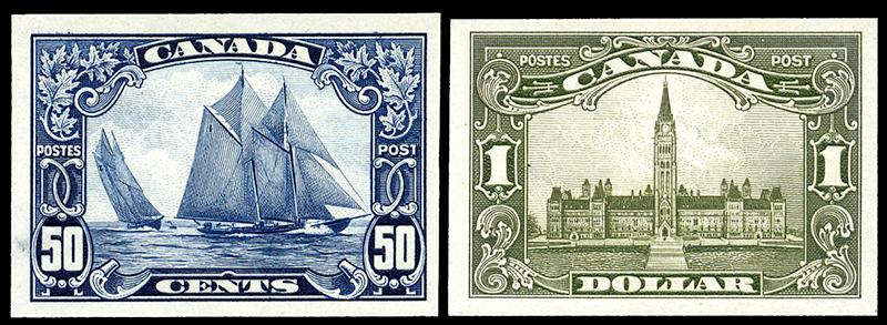 149P-159P: SCROLL ISSUE, 1¢ to $1 PLATE PROOFS on india, in colour of issue, some natural paper fiber thins and pin holes, 12¢ corner crease, appears very fine (Image)