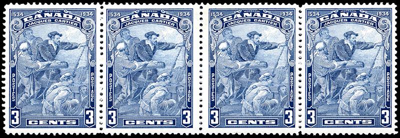 208i,208iv: 1934 Jacques Cartier, 3¢ blue BURR ON SHOULDER in WIDE GUTTER strip of four, small spot-on gum of 3rd stamps, very fine (Image)