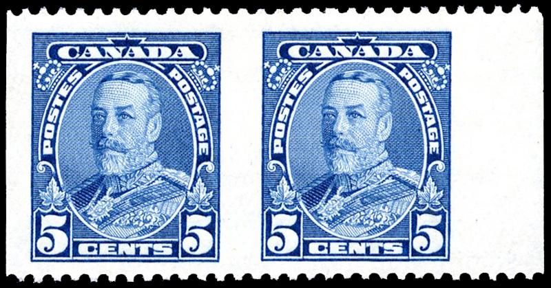 221a: 5¢ blue, right margin horizontal pair, IMPERFORATE VERTICALLY, hinged, very fine. (150 pairs) (Image)