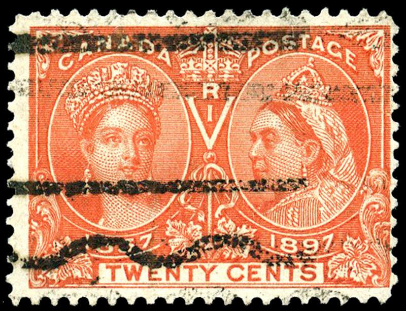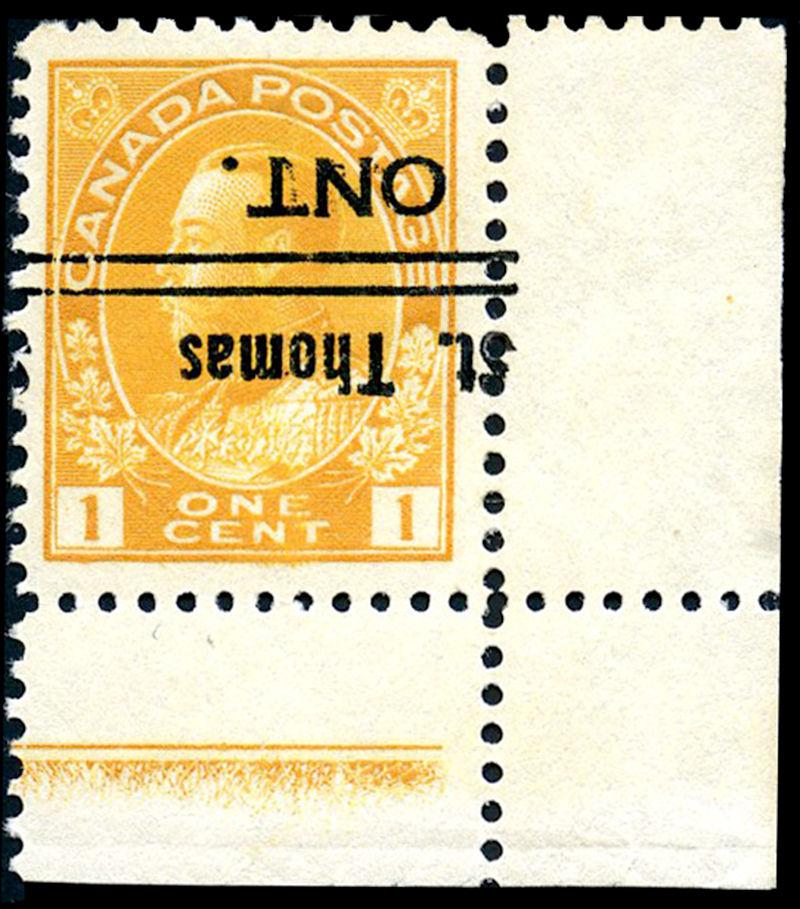 ST. THOMAS: 1-105-I: 1¢ orange yellow (wet), Die I LR corner margin with partial LATHEWORK C, and INVERTED St. Thomas ONT. og, hinged. (Image)