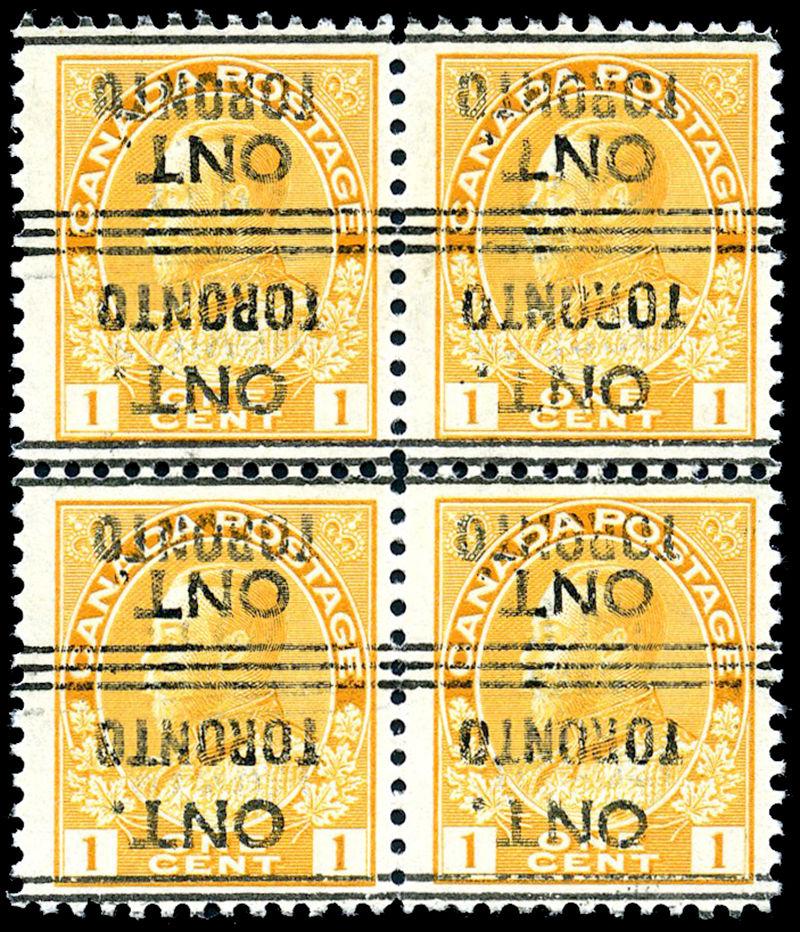 TORONTO: 12-105d-ID: 1¢ orange yellow (wet), Die II, block of four, nh, very fine (Image)