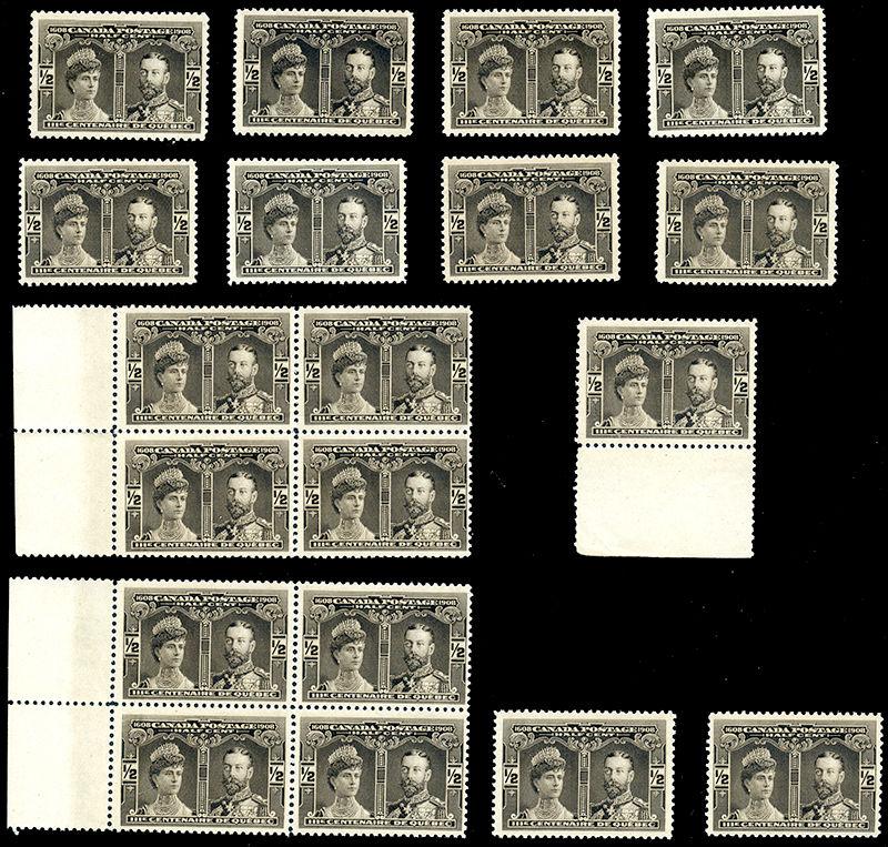 96: HALF CENT: BLACK BROWN, Two blocks of 4, eleven singles, all nh except one single with signs of a fingerprint, cataloged as fine but much appears very fine. Inspect (Image)