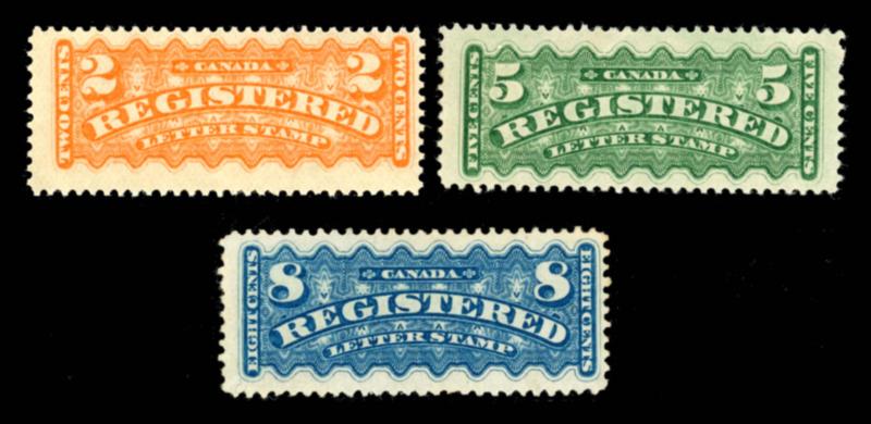 CANADA 1875-96 #F1-3 STAMPS F */**. Registration stamps issue, complete set of 3 mint stamps. The 2c is never hinged and the 5c and 8c are hinged. Unitrade 550.00$. (Image1)
