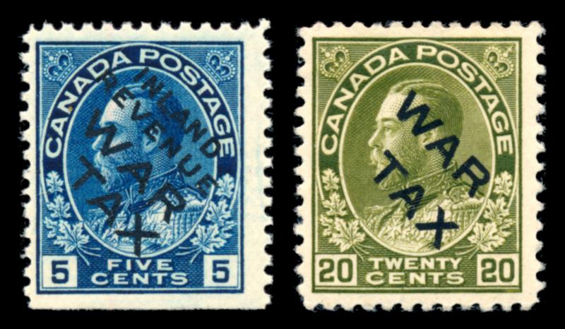 CANADA 1915 #MR2Bi-2C STAMPS F **/*. War Tax issue, King George V Admiral, 5c mint never hinged (bottom straight edge) overprinted "INLAND REVENUE WAR TAX" + 20c mint hinged overprinted "WAR TAX". Unitrade $380.00. (Image1)