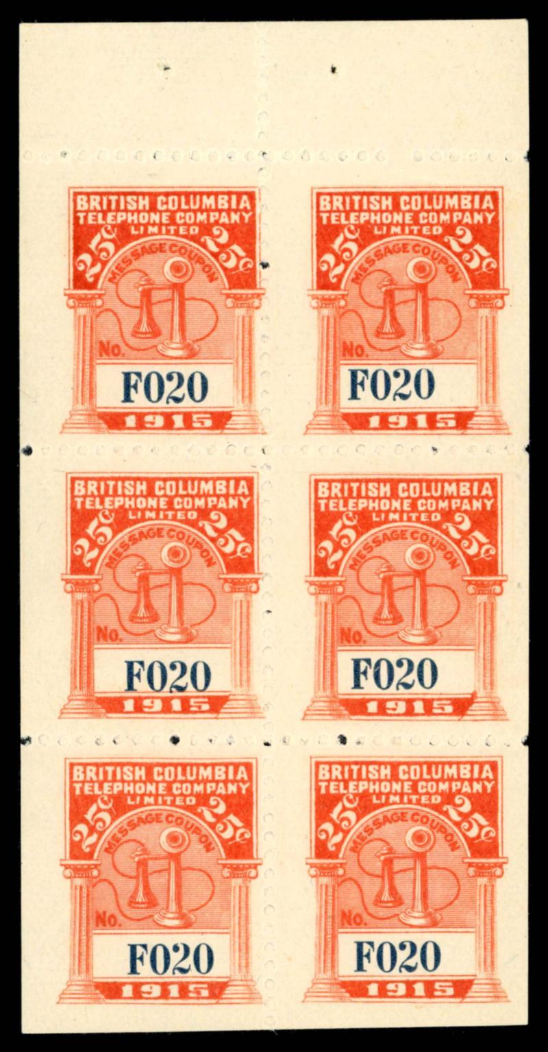 CANADA REVENUE 1915 #BCT56 PANE OF 6 STAMPS VF **. British Columbia 1915 Telephone Company Limited #BCT56 booklet pane of 6 stamps with tab mint never hinged. Van Dam $350.00. (Image1)