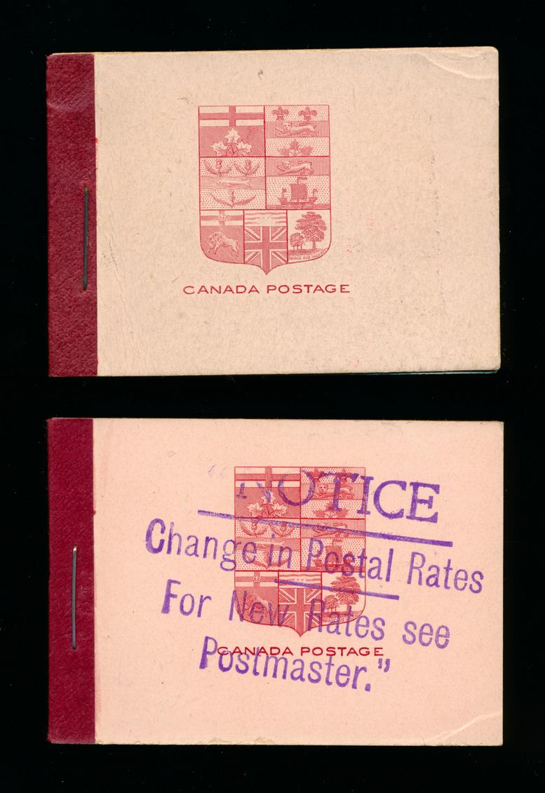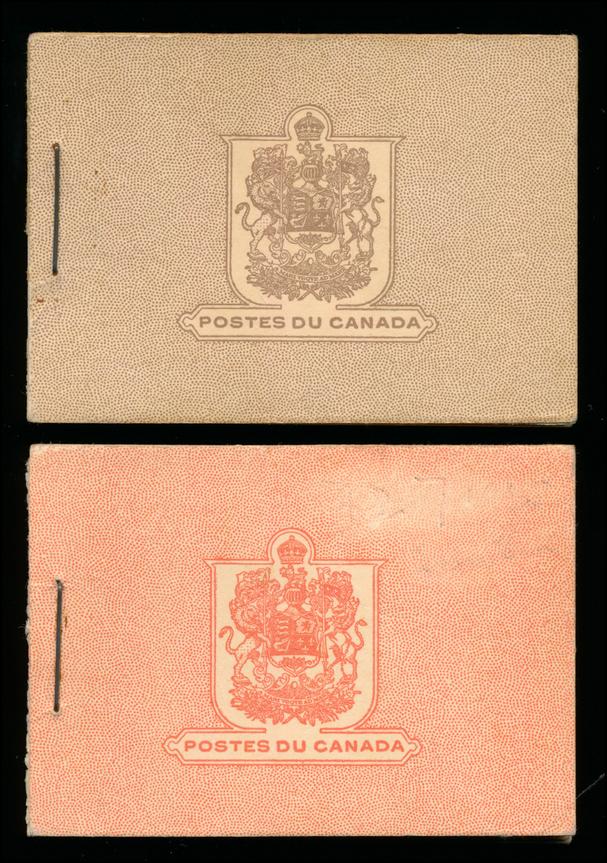 CANADA 1935 1935 #BK25-26 BOOKLETS F-VF **. King George V 1935 issue, 2 complete booklets. BK25 contains 2 panes of 6 stamps of the 2c brown (#218a) and BK26 contains 2 panes of 4 stamps of the 3c dark carmine (#219a) + 2 labels. Unitrade $650.00. (Image1)