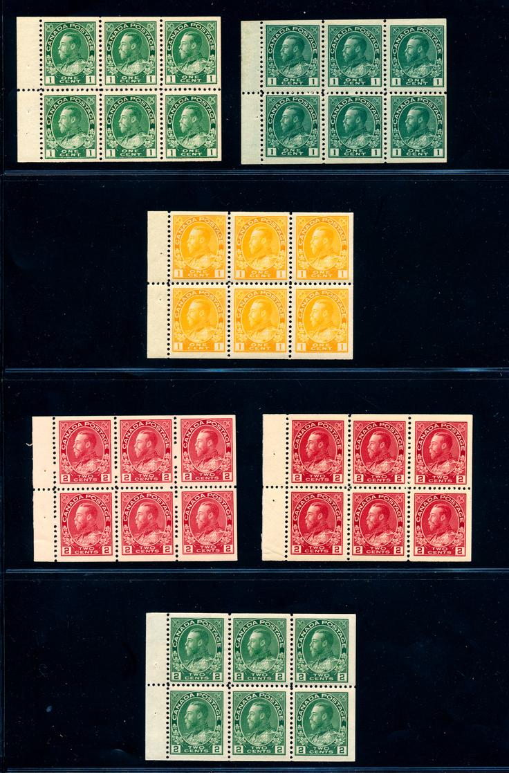 CANADA 1913-1922 SELECTION BOOKLET PANES F-VF **. Selection of 6 booklet panes of 6 stamps from the King George V Admiral issue. Numbers are: #104a and 104aii (1c green and blue green shades), 105a (1c yellow), 106a x2 (2c dark carmine and pink shades) and 107c (2c green). Panes are mint never hinged. Unitrade $1280.00. (Image1)
