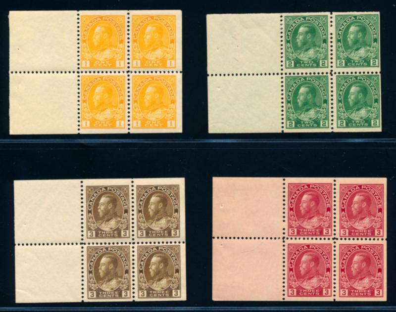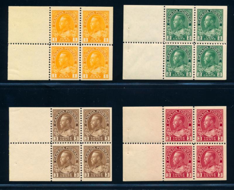 CANADA 1918-1922 SELECTION BOOKLET PANES F-VF **. Selection of 4 booklet panes of 4 stamps from the King George V Admiral issue. Numbers are: # 105a (1c yellow), 107b (2c green), 108a (3c brown) and 109a (3c carmine). Panes are mint never hinged. Unitrade $510.00. (Image1)