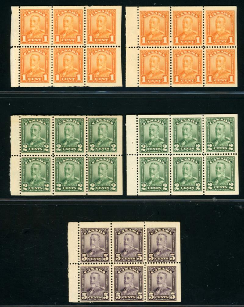 CANADA 1928-1929 SELECTION BOOKLET PANES F-VF **. King George V Scroll issue, selection of 5 booklet panes of 6 stamps mint never hinged. Numbers are: 149a Fine, 149a Very Fine (1c orange), 150a Fine, 150a Very Fine (2c green) and 153a Fine (5c violet). Unitrade $495.00. (Image1)