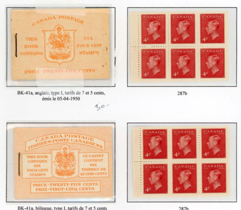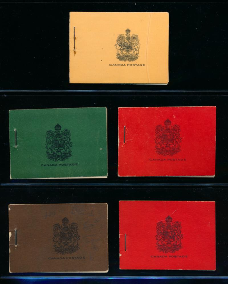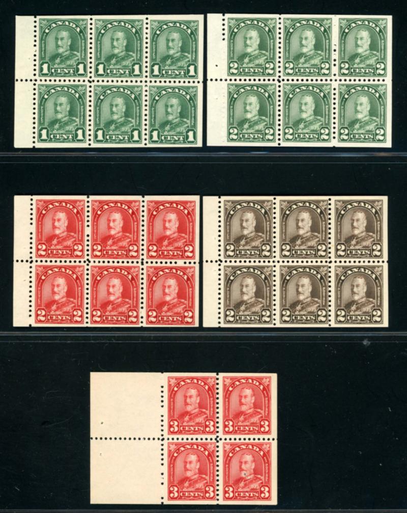 CANADA 1928-1931 SELECTION ENGLISH BOOKLETS F-VF */**. King George V Scroll issue, selection of 5 English booklets. Numbers are: BK11, 1c orange (4 panes of 6 stamps, top middle stamp on each pane is hinged), BK14a, 1c deep green (3 panes of 6 instead of 4), BK16a, 2c deep red (2 panes of 6), BK17a, 2c dark brown (1 pane of 6 instead of 2) and BK18a, 3c deep red (2 panes of 4). Unitrade $800.00. (Image1)