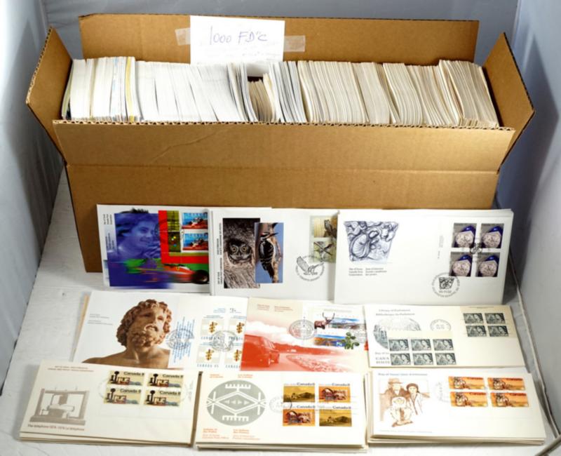 CANADA ACCUMULATION FDC VF. Box containing 1000 first day covers from Canada Post with a total face value of $801.00. Heavy duplication. Starting bid $100.00. (Image1)