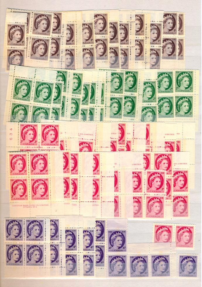 CANADA FACE VALUE ACCUMULATION STAMPS VF **. Stockbook containing mint never hinged stamps with marking strips, mostly in blocks or corner blocks (some coil stamps and regular corner blocks). Large duplication. Total face value $584.24. (Image1)
