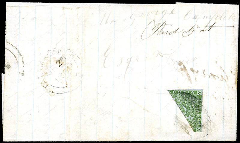 4a: SIX PENCE: YELLOW GREEN, BISECT tied to large part of folded letter, TATAMAGOUCHE 62 MR 1860 double broken circle to Truro, manuscript 'Paid 5 cts', fine. 1996 Brandon Cert (Image)