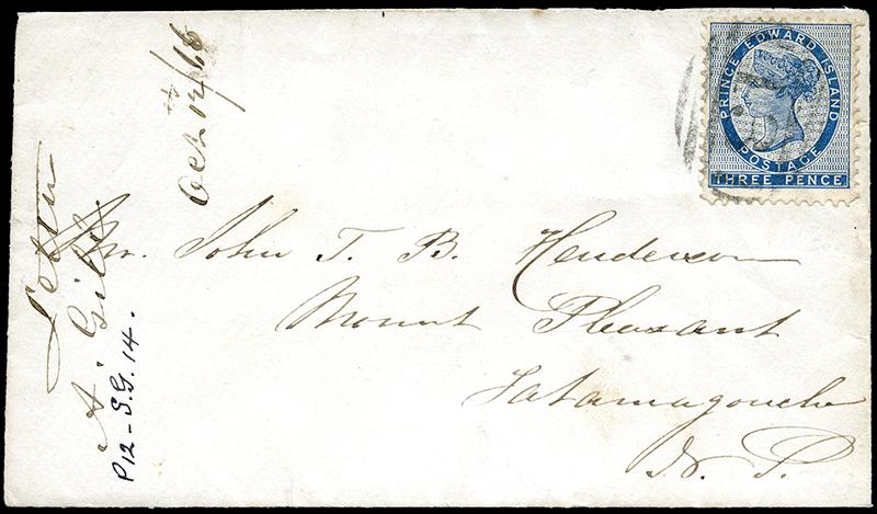 6: THREE PENCE BLUE, tied to small cover by Charlottetown Numeral 13 to small cover to Tatamagouche, PRICE EDWARD ISLAND 12 OC 1866 and 13 OCT receiver, clean (Image)