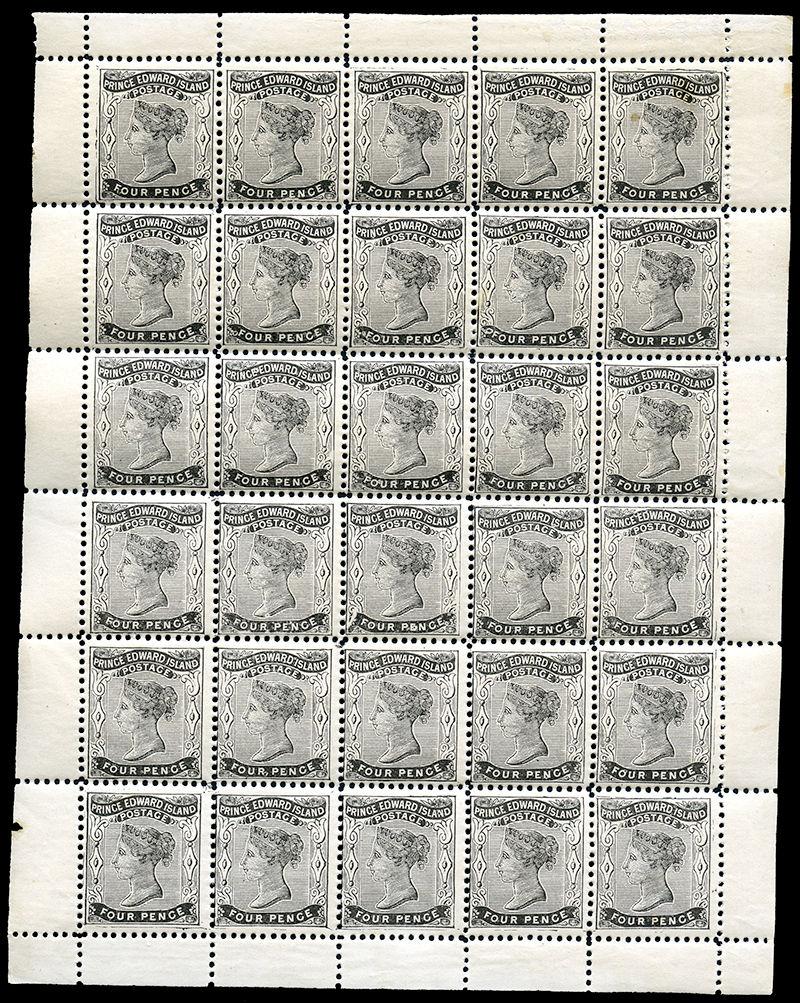 189var: 4¢ Prince of Wales, rose lake, 21mm, watermarked, LL corner margin IMPERFORATE BLOCK OF 36, no gum as issued, very fine. (NSSC 180y US $1620) (Image)