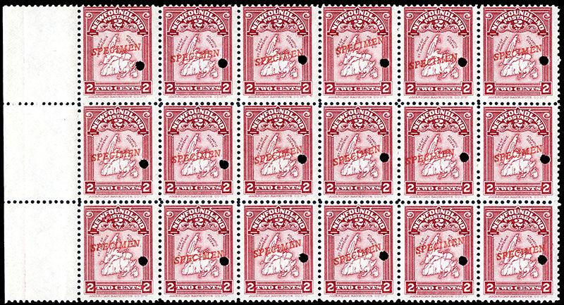 86s: 2¢ Map, rose carmine, serifed diagonal SPECIMEN overprint and security punch hole, left margin block of 18 (6x3), nh, fine (Image)