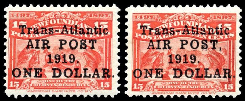 C2,C2a: 1919 Alcock and Brown one WITH (back stamped Kessler), and one WITHOUT COMMA AFTER POST, og, f-vf (Image)