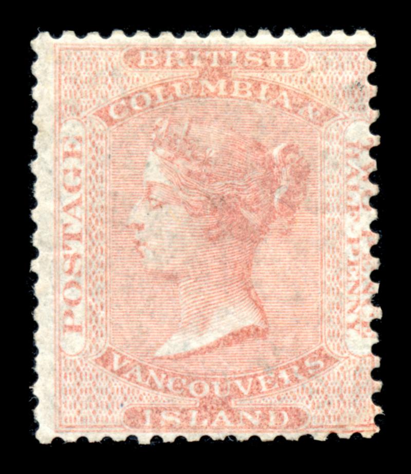 BRITISH COLUMBIA & VANCOUVER ISLAND 1860 #2a STAMP VF *. Two and half pence pale dull rose Queen Victoria issue. The stamp is perforate 14 and mint lightly hinged with original gum. 2020 Vincent Greene Foundation certificate. Unitrade $600.00. (Image1)