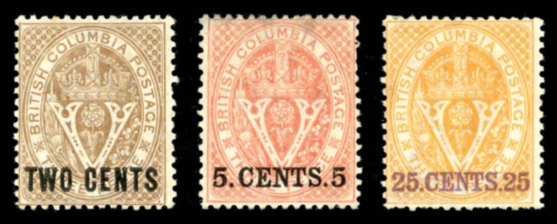 BRITISH COLUMBIA 1867-71 #8-9 + 11 STAMPS F-VF *. Seal of British Columbia issue, selection of 3 stamps mints hinged and surcharged with different values. Unitrade $730.00. (Image1)