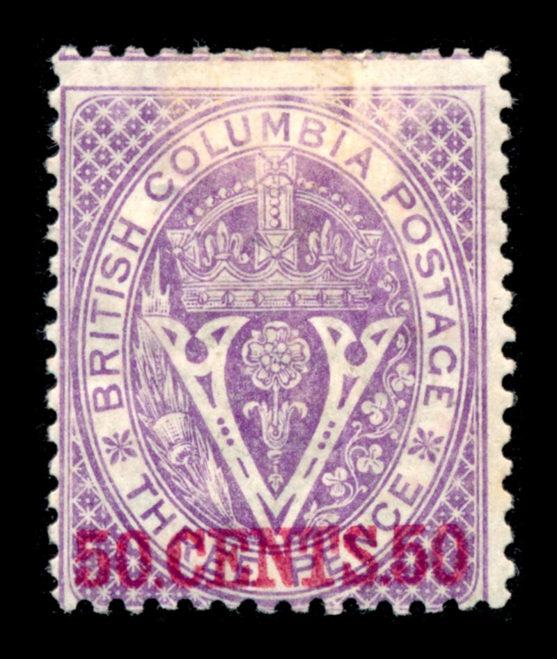 BRITISH COLUMBIA 1867-71 #12 STAMP F *. Seal of British Columbia issue, the stamp is mint hinged and surcharge in red 50 cents. Nice and rare stamp. Unitrade $800.00. (Image1)