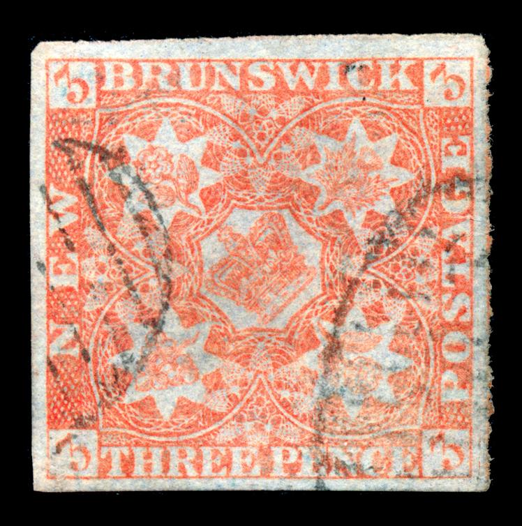 NEW BRUNSWICK 1851 #1 STAMP VF/O. 3d red Pence issue, the stamp is canceled, imperforate with 4 margins. Unitrade $700.00. (Image1)