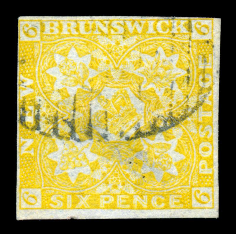 NEW BRUNSWICK 1851 #2 STAMP VG/O. 6d olive yellow Pence issue, the stamp is canceled, imperforate, missing the left margin and is thinned. Unitrade $800.00. (Image1)