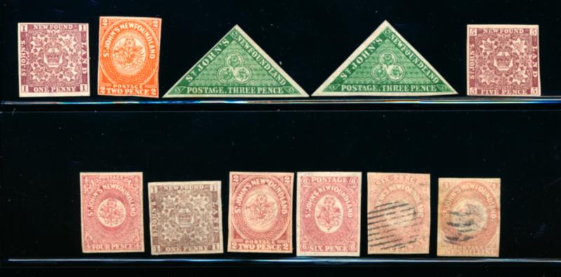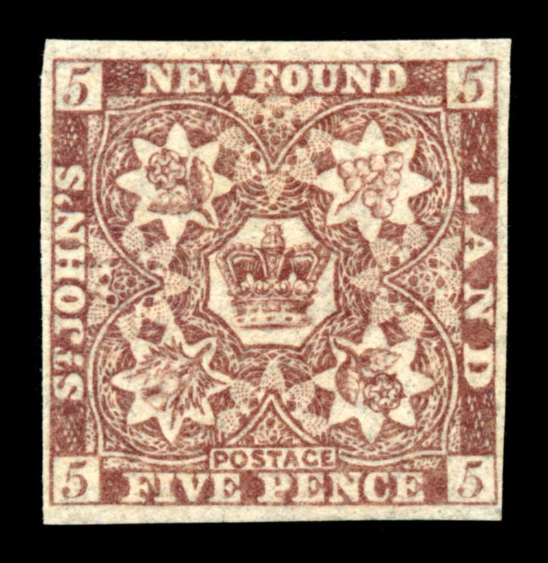 NEWFOUNDLAND 1860 #12A STAMP F-VF *. 5 pence violet brown, Heraldic Flowers and Crown, the stamp is mint with small part of original gum. 2018 Vincent Greene Foundation certificate. Starting bid $50.00. (Image1)