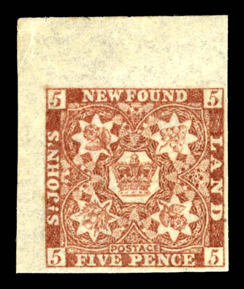 NEWFOUNDLAND 1860 #12A STAMP SUPERB **. 5 pence violet brown Heraldic Flowers issue. Superb stamp imperforate with top left corner and 4 margins and mint never hinged. Show piece, starting bid $100.00. (Image1)