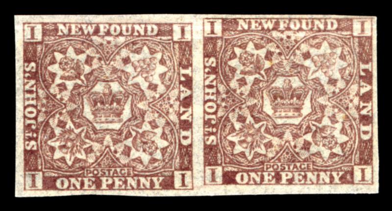 NEWFOUNDLAND 1861-1862 #15Ac PAIR STAMPS VF **. Horizontal pair of the one penny chocolate brown Heraldic Flowers and Crown. The stamps are imperforate and mint never hinged with 4 margins. 2015 AIEP certificate. Unitrade $2000.00. (Image1)
