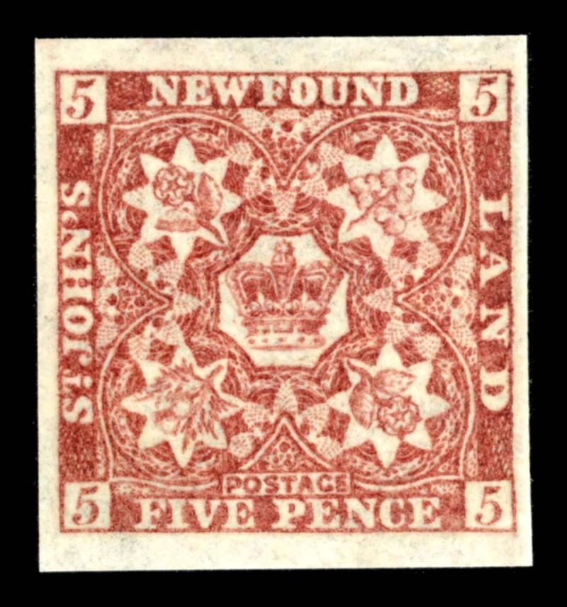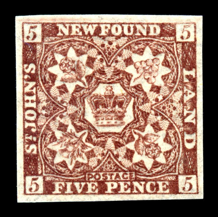 NEWFOUNDLAND 1861-1862 #19 STAMP VF **. 5 pence reddish brown Heraldic Flowers issue. Very nice stamp imperforate with 4 complete margins and mint never hinged. starting bid $75.00. (Image1)