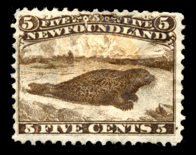 NEWFOUNDLAND 1865 #25 STAMP F *. 5 cents brown Harp Seal, the stamp is mint hinged. Unitrade $400.00. (Image1)