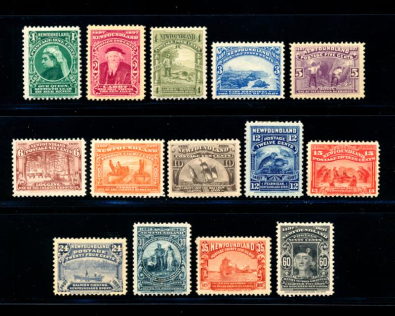 NEWFOUNDLAND 1897 #61-74 STAMPS F-VF */**. Discovery of Newfoundland issue, complete set of 14 mint stamps. Very nice centering for almost all the stamps and numbers 61, 62, 64, 65, 66, 71 and 73 are never hinged. Unitrade $450.00. (Image1)