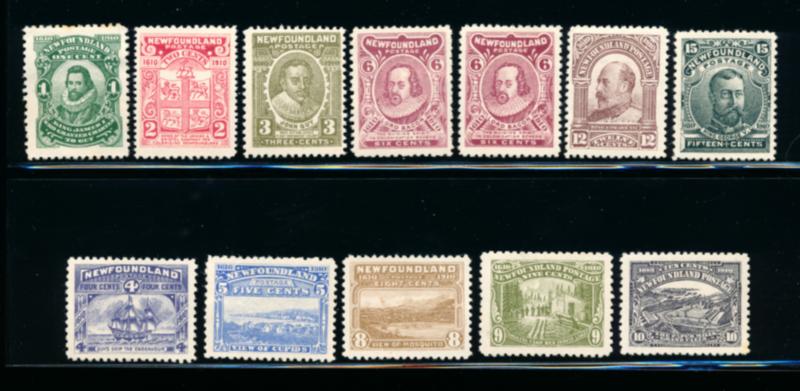 NEWFOUNDLAND 1910 #87-97 STAMPS F-VF */**. John Guy lithographed issue, complete set of 12 mint stamps. Numbers 88, 89 and 93 are never hinged and numbers 90, 91, 94. 95 and 97 are well centered. Unitrade $706.00. (Image1)