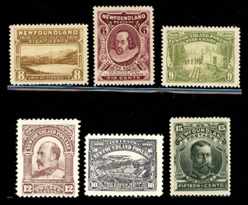 NEWFOUNDLAND 1911 #98-103 STAMPS F-VF */**. John Guy engraved issue, complete set of 6 mint stamps. Numbers 98 to 100 and 103 are never hinged and numbers 98 to 100 are also well centered. Unitrade $805.00. (Image1)