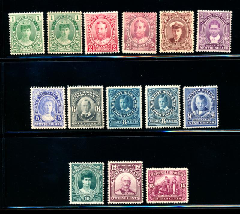 NEWFOUNDLAND 1911 #104-14 STAMPS F-VF */**. Royal Family issue, complete set of 14 mint stamps. Numbers 104, 107, 107 and 111 are never hinged and numbers 106, 108, 109, 110, 110a, 111, 113 and 114 are well centered. Unitrade $678.00. (Image1)