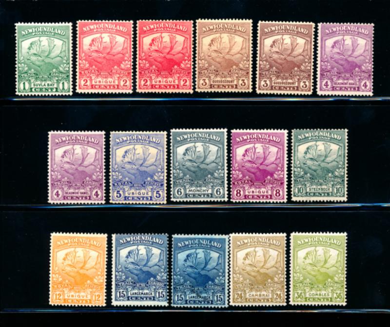 NEWFOUNDLAND 1919 #115-26 STAMPS F-VF */**. Trail of the Caribou issue, complete set of 16 mint stamps (including 116b, 117b, 118b and 124b). Numbers 115, 116, 117, 117b, 118 and 125 are never hinged and numbers 115, 117, 117b, 118b, 119 and 120, are well centered. Unitrade $500.00. (Image1)