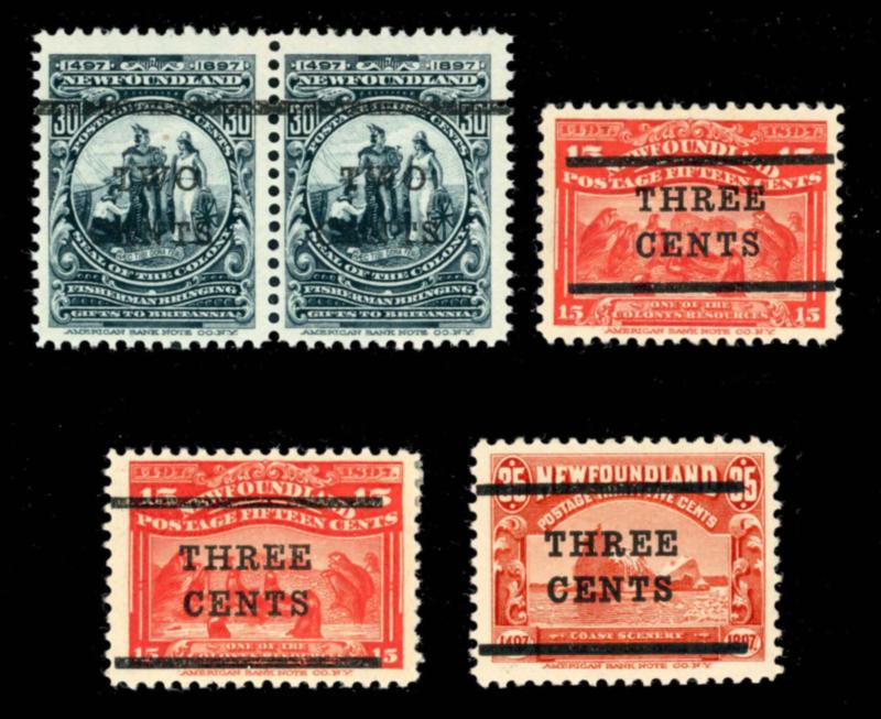 NEWFOUNDLAND 1920 #127-30 STAMPS F-VF */**. Selection of 5 mint stamps with surcharges. Numbers are: #127** pair, 128*, 129* and 130*. Unitrade $345.00. (Image1)