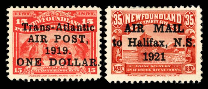 NEWFOUNDLAND 1921 #C2-3 STAMPS F *. Airmail stamps surcharged, "C2 "Trans-Atlantic AIR POST, 1919. ONE DOLLAR." and #C3 "AIR MAIL to Halifax, N.S. 1921". Unitrade $340.00. (Image1)